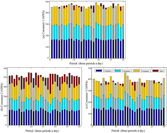 Figure 5 shows the daily purchase strategies of three large consumers in a month. One can see that each consumer will purchase the majority of energy via bilateral contract transaction with generation companies because the bidding price is cheaper than spot price. Furthermore, since large consumer 2 has a higher demand than the other 2 consumers, it purchases more energy from spot market than other consumers. The reason is that bidding price increases linearly with the increasing of contract quantity, and the price will be more expensive than spot price if consumer 2 purchases more energy via contract transaction. Additionally, according to the bidding price and contract quantity, the profit of each generation company can be obtained. After some calculation, the profits of three companies are shown as follows: 1,085,865 yuan for company a; 750,980 yuan for company b; 1,014,123 yuan for company c. In the initial situation without game optimization, the profits of three companies are 1,054,800 yuan, 674,595 yuan, and 962,340 yuan, respectively. Comparing the results of two situations, one can see that the profit of company a has increased 2.9%, the profit of company b has increased 11.3%, and the profit of company c has increased 5.4%. Therefore, each generation company has obtained more profit when Bayesian game is employed to optimize the strategy of bidding price.