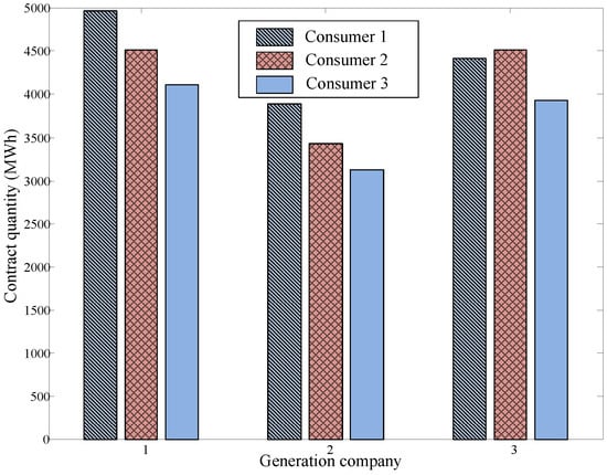 In order to analyze the difference between complete information game and Bayesian game, we take the case with complete information into consideration. That is, the type of each generation company is known to all companies. For the purposes of comparison, the generation cost of each company in the complete game is the same with the data of type 1 in the Bayesian game. The optimal strategies of bidding price under the case with complete information game are shown in Table 4. The contract quantities of each generation company with three large consumers are shown in Figure 6. From the figure, we can see that the contract quantities of generation company a with three large consumers are 4974.24 MWh, 4513.58 MWh, and 4110.63 MWh, respectively; contract quantities of generation company b with three large consumers are 3890.30 MWh, 3431.61 MWh, and 3126.21 MWh, respectively; contract quantities of generation company c with three large consumers are 4416.57 MWh, 4513.10 MWh, and 3928.38 MWh, respectively. After some calculation, the profits of the three companies are shown as follows: 1,109,395 yuan for company a; 772,444 yuan for company b; 1,021,038 yuan for company c. One can see that the profit of each generation company is reduced compared with the results of the complete game. The decrease rates are 2.2% for company a, 2.9% for company b, and 0.7% for company c. The results demonstrate that the incomplete information is a disadvantage for each generation company, just from the perspective of profit. However, since the generation cost function is a commercial secret which needs to be protected, each generation company would not unveil the function to other competitors. Thus, it has practical significance to study the competition among generation companies with incomplete information.