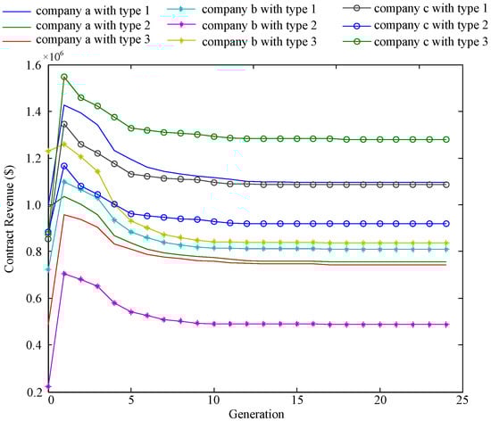 Based on the above parameters, the Bayesian game among generation companies and large consumers in the bilateral contract transaction can be solved with the proposed algorithm. After some calculations, we can obtain the Bayesian Nash equilibrium about bidding price of the generation companies. Consequently, the contract price of generation companies with different types is presented in Table 3. Since generation companies with different types have different cost models, contract price is different when the Nash equilibrium is reached. One can see that generation companies with different types have different bidding price strategies. Accordingly, large consumers will have different strategies for contract quantity. Since each generation company has a type space with three types, there are type combinations. Under each type combination, every large consumer will have a specific purchase strategy. This means that there are total 27 kinds of optimal purchase strategies. We have given the results of optimal purchase strategies for three large consumers in Table A1 in Appendix A. In order to facilitate the analysis, the type combination (1, 2, 3) is taken as an example. Note that combination (1, 2, 3) means company a belongs to type 1, company b belongs to type 2, and company c belongs to type 3. From Table A1, we can see that the contract quantities of generation company a with three large consumers are 5015.67 MWh, 4767.08 MWh, and 4405.43 MWh, respectively; contract quantities of generation company b with three large consumers are 2783.09 MWh, 2257.09 MWh, and 1888.22 MWh, respectively; contract quantities of generation company c with three large consumers are 5484.05 MWh, 5217.74 MWh, and 4743.57 MWh, respectively.