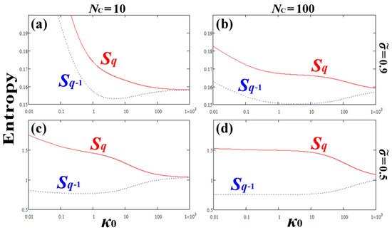 Figure 1 plots both the entropic formulations and , as a function of the (invariant) kappa index κ0. We observe that the entropy decreases monotonically when the kappa index increases, while increases when the kappa index increases for stationary states near thermal equilibrium (κ0→∞). For large values of the kappa index tending to infinity, both entropic formulations tend to be equal to each other, recovering BG entropy. The two functional behaviors are summarized as: