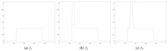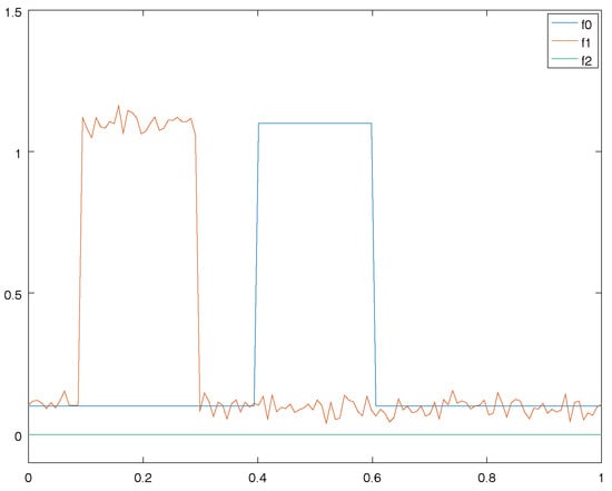 Three functions defined on the interval . The blue one () is a step function, the red one () is a translated version of the blue one when noise has been added, and the green one () is the null function.