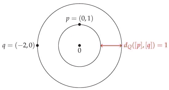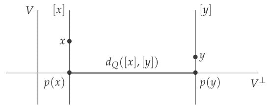 One particular distance in the ambient space M, which we use in all this article, is the distance given by the norm of the Hilbert space: . Moreover we say that G acts isometrically on M, if is a linear map which leaves the norm unchanged. In this case the distance given by the norm of the Hilbert space is invariant under the group action. The quotient (pseudo)-distance is, in this case (see Figure 2), .