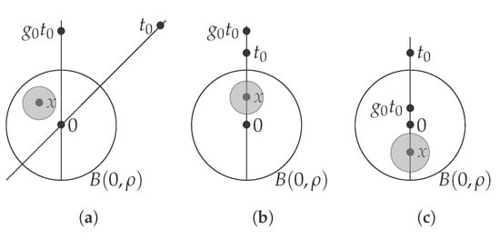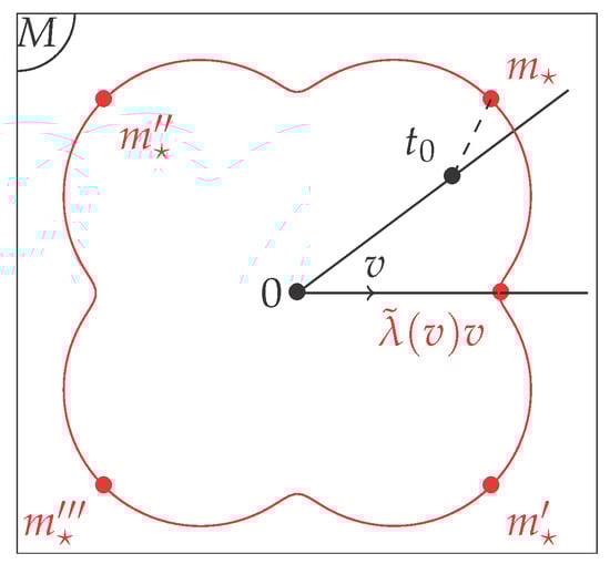 In order to prove Inequalities (3), we use the “polar” coordinates of a point in M (see Figure 4), every point in M can be represented by where is the radius, and v belong to S the unit sphere in M, v represents the “angle”. We compute as a function of . In a first step, we minimize this expression as a function of r, in a second step we minimize this expression as a function of v. This makes appear the constant K. As we said, let us take and , we expand the variance at the point :