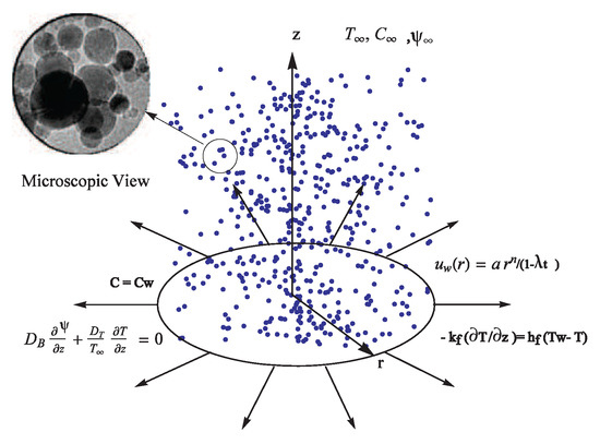 Consider the unsteady three-dimensional MHD flow of an incompressible viscous flow of nanofluid. A cylindrical coordinate system is used. The velocity of the stretching sheet is assumed to be nonlinear along the radial direction. It is assumed that there is no nanoparticle flux across the wall, and the surface is stretching along the z-direction. In the ambient fluid, the temperature, solute concentration and nanoparticle concentration are denoted by and , respectively (see Figure 1). Here, , and represent the solute concentration, constant temperature and nanoparticle concentration respectively on the wall. The variable magnetic field intensity is denoted by where t represents time. The magnetic field acts in the positive z-direction normal to the sheet. In this study, generalizes the magnetic field term provided previously in [9,10] to: