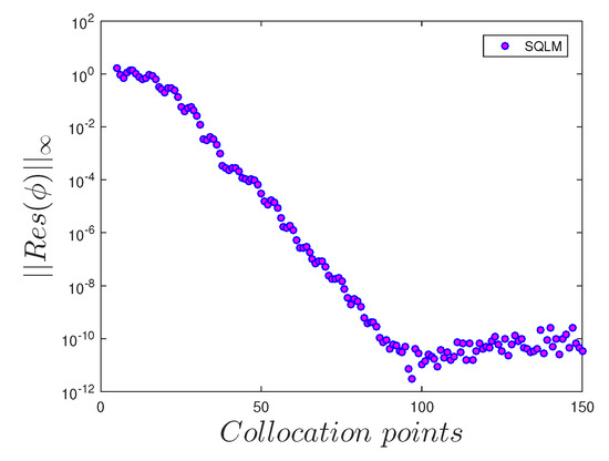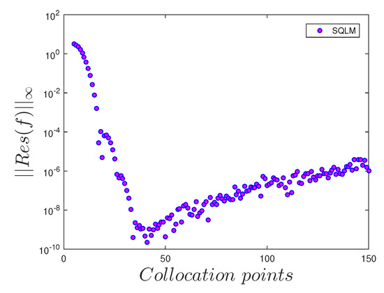 In Figure 2, it is observed that the optimal residual error for the velocity profile is around , which is achieved when the number of the collocation points is within the range 30 and 40; beyond that range, the accuracy starts declining. From Figure 3 and Figure 5, it is noted that the optimal residual errors for the temperature and nanoparticle concentration profiles, respectively, are found around when the number of collocation points is within 100 and 120. Figure 4 shows that the optimal residual of the solute concentration profile occurs approximately at when the number of collocation points is between 80 and 100. It is interesting to note that there is no magic number of collocation points that induces the optimal residual errors for all of the physical properties. Additionally, there is variability in the behavior of the decline of the accuracy after the range at which the optimal residuals are obtained; for instance, in Figure 2, the accuracy of the solution of the velocity profile declines much faster as compared to the accuracy of the solution of temperature, solute concentration and nanoparticle concentration profiles respectively shown in Figure 3, Figure 4 and Figure 5. Overall, these results demonstrate the accuracy and convergence of the SQLM technique.