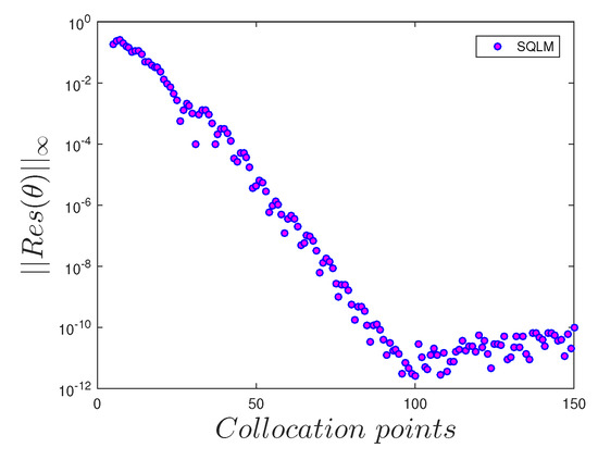 Effects of the number of collocation points number on the residual error of the temperature profile when , .