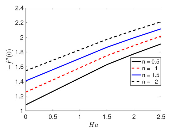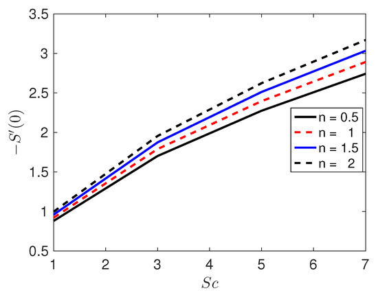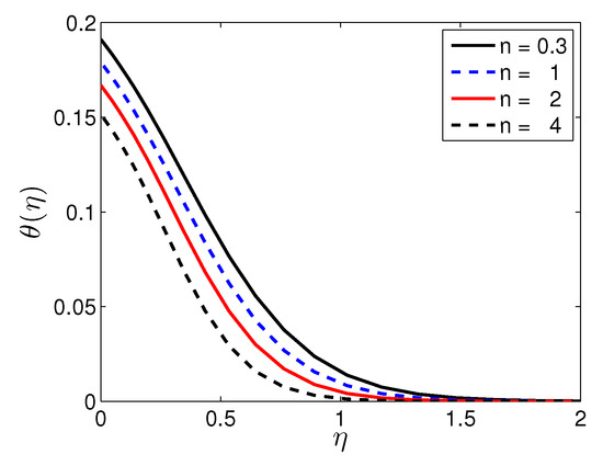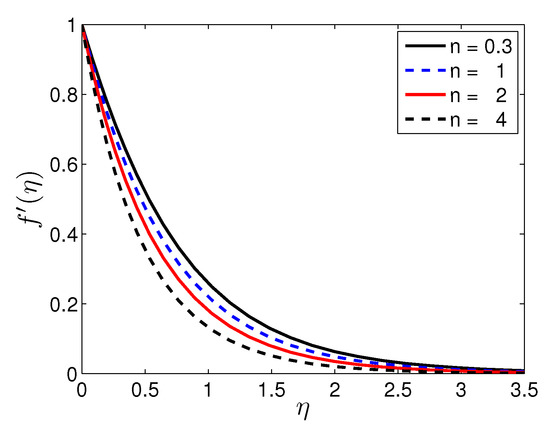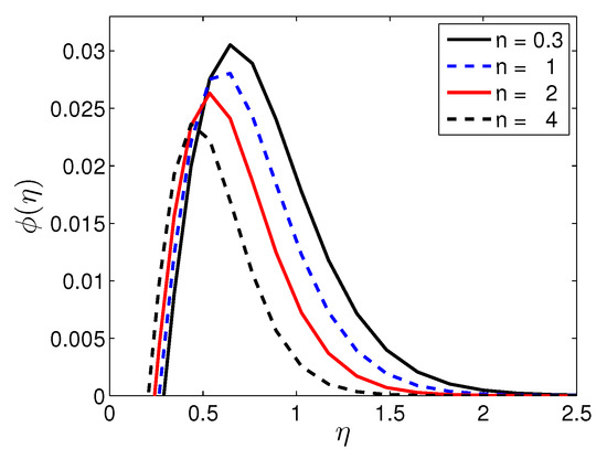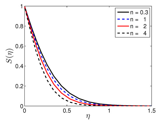 The parameter n plays an important role in fluid flow. A fluid is called pseudoplastic fluid when and dilatant fluid when . It is a Newtonian fluid when . A fluid is shear-thinning or shear-thickening according as or . The effect of n on the fluid velocity, temperature and solute concentration profiles, respectively, is shown in Figure 6, Figure 7 and Figure 8. Figure 6 illustrates the velocity profile () with the variation in the stretching sheet parameter keeping other parameters fixed. The magnitude of the radial component of the velocity decreases with increasing n. In contrast, n has a significant impact on and the velocity components u and w, respectively. Figure 7 shows that an increases in n leads to a decrease in the thickness of the thermal boundary layer. As a result, the temperature decreases with increasing n and an increase in the heat transfer rate from the sheet. Increasing n increases the deformation rate from the wall to the fluid. Figure 8 shows the effect of n on the solute concentration when the other parameters take fixed values. It is noticed that increases in the non-linear stretching lead to a decrease in the solutal concentration.