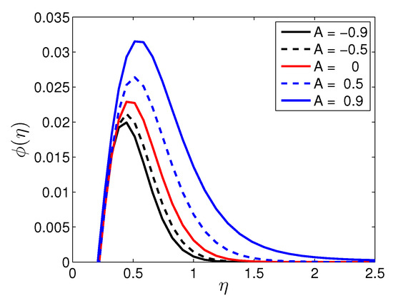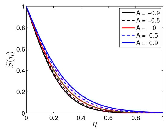Figure 9 and Figure 10 describe the effects of unsteadiness parameter A on the temperature and the solute concentration profiles, respectively. Two cases have been studied, namely and . From Figure 9, it is observed that the temperature increases with increasing values of . A similar effect is observed for . That the temperature decreases, as moving far away from the stretching sheet in the dynamics region due to the increase of the unsteadiness parameter. Physically, the decrease of temperature can be attributed to heat lostfrom the sheet as a result of the increase in the unsteadiness. Similar properties of solute concentration profiles are observed in Figure 10.