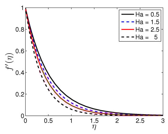 Effects of the Hartmann number () on for ,