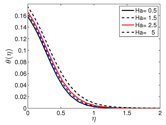 Figure 11 and Figure 12 demonstrate the behavior of several values of the Hartmann number on the velocity and temperature profiles when the other physical parameters are fixed. Figure 11 shows that the dimensionless radial component of the velocity decreases as the Hartmann number increases. This is an indication of a Lorentz force slowing the motion of the fluid in the radial direction. Consequently, the boundary layer thickness increases. The physical implication is that the momentum of the fluid flow may be controlled through an applied magnetic field. Figure 12 shows that the temperature increases with an increase in the Hartmann number due to the effect of the transverse magnetic field in the fluid. It is also worth noting that the application of the magnetic field affects the thermal boundary layer thickness positively in the sense that the thickness of the thermal boundary increases in the presence of a magnetic field.