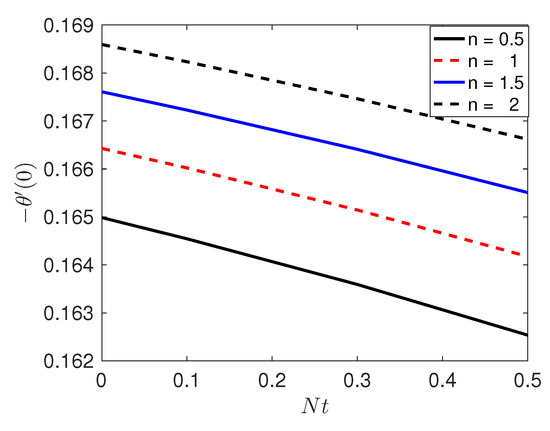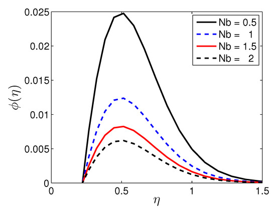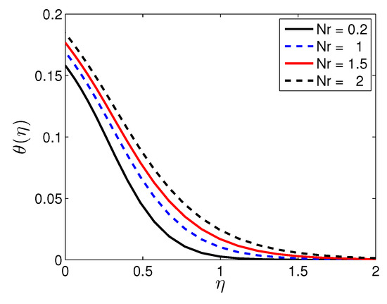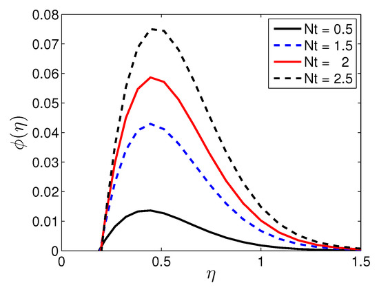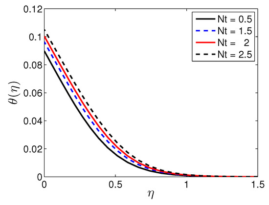 Figure 15 illustrates the behavior of the temperature profiles with different values of the thermophoresis parameter, , when the other parameter are fixed. It is observed that the temperature increases as the thermophoresis parameter increases because the thermal boundary layer increases with increases in the thermophoresis parameter.
