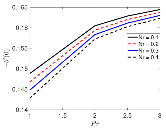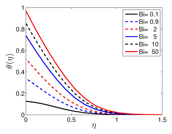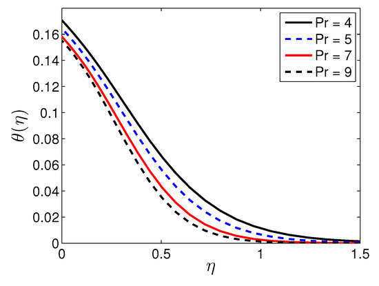 Figure 14 presents the influence of the Prandtl number on the temperature profiles. As the Prandtl number increases, the temperature decreases. Smaller Prandtl numbers suggest a fluid with higher thermal conductivities; hence, heat diffuses more rapidly from the heated surface than in the case of fluids with higher Prandtl numbers.