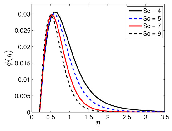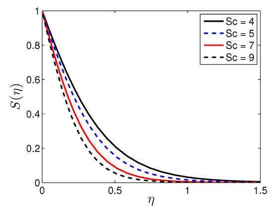 Figure 16 demonstrates the influence of the Schmidt number on the solute concentration profile with fixing the other parameters. It is noticed that the solute concentration decreases as the Schmidt number increases.
