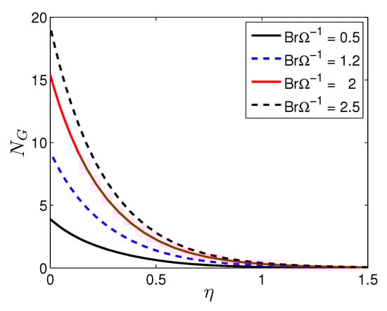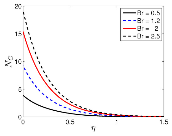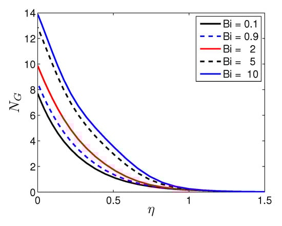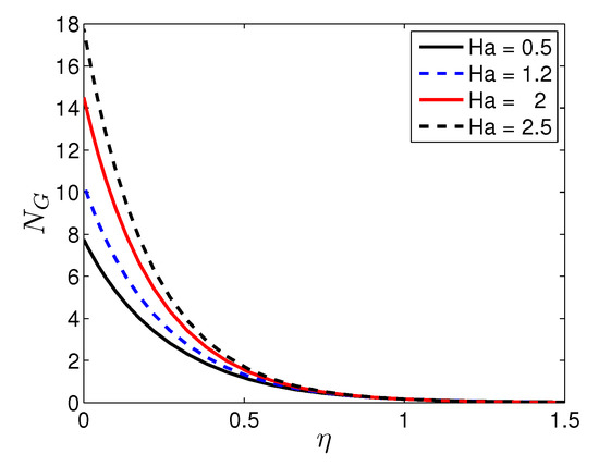 In Equation (27), the entropy generation is stated in four parts. The first part is entropy generation due to heat transfer irreversibility; the second part is the entropy generation due to the viscous dissipation irreversibility; the third part is the entropy generation due to the applied magnetic field irreversibility; and the fourth part is due to the diffusive irreversibility.