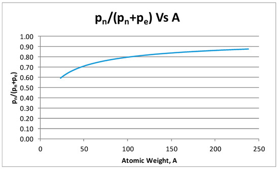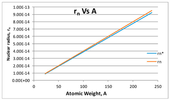 In order to have minimum entropy [21,22,23,24,25,26,27], every part of the atom should have a shape and structure optimal in a way that the whole system works as one. The Equation (8) only depends on the nucleus radius. The minimum nucleus radius will be used rn* = rp A1/3 instead of the traditional nucleus radius given by rn* = 1.2 A1/3. This new equation can be obtained from the following volumetric relation: