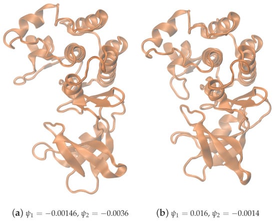 Two particular conformations from the two local maxima shown in Figure 3. The system visits conformations around (a) during the first part of the simulation, and it stays near (b) during the second part.