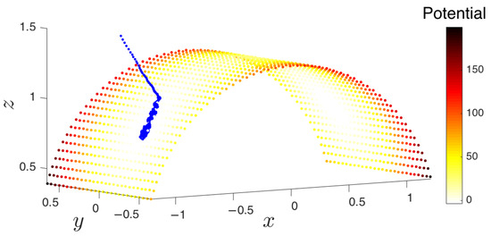 To create Figure 6 and Figure 7, the first trajectory was started with an arbitrary initial condition of and run until using the Euler–Maruyama scheme [73] with a time step length of . In each iteration of the algorithm, and therefore each run of the molecular simulator, the first 600 samples were discarded to increase the likelihood that the resulting cloud of points rested on the cylindrical manifold. To make the manifold sampling more homogeneous, points were removed such that a minimum distance of 0.04 existed between each pair of points. A maximum of 3000 points was stored in memory at any given time; this parameter was based on the available memory of the machine at hand and the particular implementation of the method. Points were randomly pruned if this maximum threshold was surpassed. Once the point cloud was properly conditioned, the manifold boundary was extended by a distance of 0.25 spatial units.