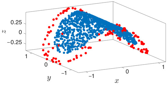 For use in the proposed exploration algorithm, we must first locate the edge points of the underlying manifold. Then, to obtain a reduced description, we can perform LPCA on small “patches” surrounding each boundary point [80,81]. Consider a single boundary point found with an appropriate boundary detection algorithm. Its k-nearest neighbors form a small neighborhood near the edge of the n-dimensional manifold. The outward normal of the manifold at this location can be approximated by locating the center of mass and creating a unit vector u from this center towards the current boundary point. By projecting u onto the linear subspace formed by the first n local principal components found by executing PCA on the neighborhood, we reduce potential noise, skewing the outward normal. The boundary point can be extended outward a given distance on this de-noised normal, thereby yielding the new initial condition to be used in the simulator. This process is repeated for each boundary point. Extension of a sample manifold using LPCA is shown in Figure 11.