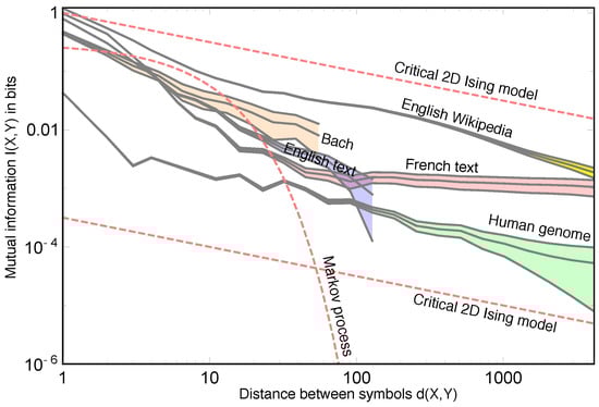In Figure 1, we plot a statistic that can be applied to all of the above examples: the mutual information between two symbols as a function of the number of symbols in between the two symbols [9]. As discussed in previous works [9,11,13], the plot shows that the number of bits of information provided by a symbol about another drops roughly as a power law (The power law discussed here should not be confused with another famous power law that occurs in natural languages: Zipf’s law [14]. Zipf’s law implies power law behavior in one-point statistics (in the histogram of word frequencies), whereas we are interested in two-point statistics. In the former case, the power law is in the frequency of words; in the latter case, the power law is in the separation between characters. One can easily cook up sequences that obey Zipf’s law, but are not critical and do not exhibit a power law in the mutual information. However, there are models of certain physical systems where Zipf’s law follows from criticality [15,16].) with distance in sequences (defined as the number of symbols between the two symbols of interest) as diverse as the human genome, music by Bach and text in English and French. Why is this, when so many other correlations in nature instead drop exponentially [17]?