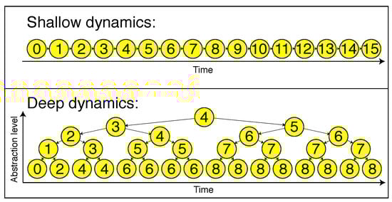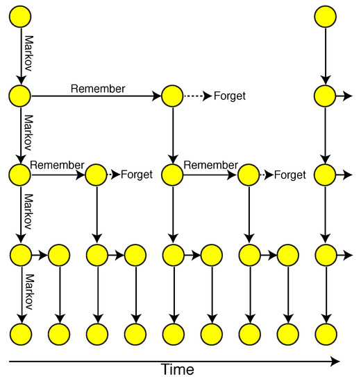 This simple approximation leads us right back to the hierarchical grammar. The first line of the above equation is labeled “remember” in Figure 2, and the second line is what we refer to as “Markov”, since the next state depends only on the previous. Since each cell perfectly remembers its previous state for time steps, the tree can be reorganized so that it is exactly of the form shown in Figure 4, by omitting nodes that simply copy the previous state. Now, supposing that grows exponentially with depth , we see that the successive layers become exponentially sparse, which is exactly what happens in our deep grammar model, identifying the parameter q, governing the growth of the forget timescale, with the branching parameter in the deep grammar model (compare Figure 2 and Figure 4).