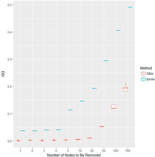 Comparison boxplots of the r(k) disturbances for in-degree (DEin) and Entropy Variation with in-degree as its information function (EnVin). The randomization is repeated 50 times.