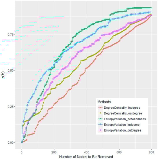 The comparative plot in Figure 4 suggests that the performance of the Entropy Variation (either with in-degree, out-degree, or betweenness) has been notably improved than that of the Degree centralities, though Entropy Variation is calculated on the basis of degree (or betweenness). For a comprehensive comparison, we will sum over r(k) from k = 1 to k = 800. Entropy Variation with betweenness wins the best performance, with the sum of r(k) as 548.27, while the sum of r(k) for out-degree is only 440.42. Thus the r(k) is raised by almost a quarter (24.49%).