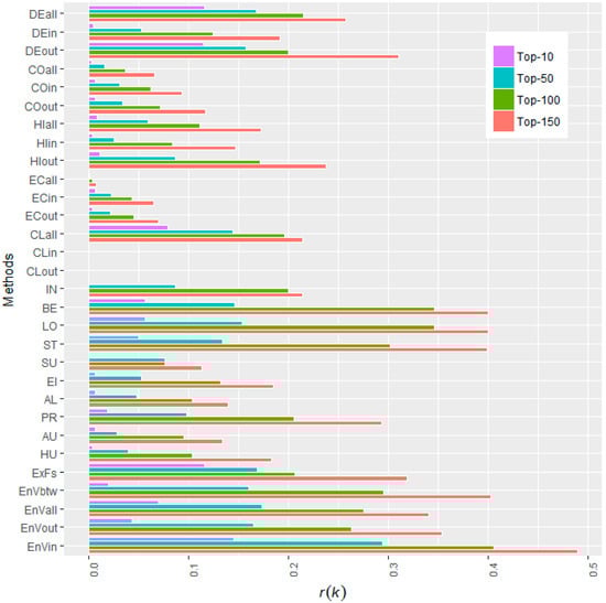 Considering that the orders of the networks (#node, number of nodes) differ greatly, ranging from 32 (the Hens network) to 6301 (the Gnutella network), we will only calculate the r(k = 10). Given the r(k = 10) values are not scaled by the orders of the networks, our attention is focused mainly on each column, comparing the r(k) values in the same column, which reveals the performance of different methods on the same network. The r(k = 10) values of different methods on different networks are arranged as a matrix, as shown in Figure 6.