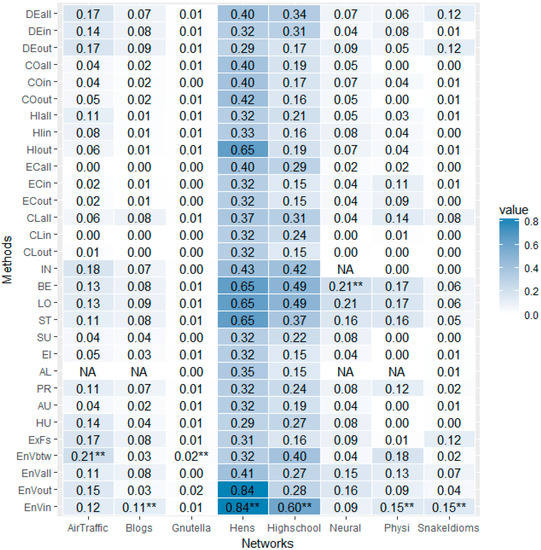 It can be seen that the darkest parts of most of the columns lie in the last four lines, which reveals the advantage of the proposed Entropy Variation, regardless of its different information functions. More specifically, the last line, Entropy Variation with in-degree as its information function (EnVin), is marked with “**” five times, which indicates that, for five of the eight networks, namely, Blogs, Hens, High School, Physicians and Snake Idioms Network, the entropic metric, EnVin, outperforms all other ranking methods. For the other two networks, Air Traffic Control (AirTraffic) and Gnutella, Entropy Variation with betweenness (EnVbtw) performs the best. It should be mentioned that the proposed Entropy Variation is not always the best, such as in the case of Neural network, where betweenness gains the highest r(k) score.