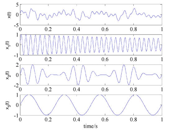 Note that the number of modes k is adaptively obtained and unchangeable in EEMD and LMD methods, however, the number of IMFs is required to predetermine for VMD method, thus the number of IMFs k in VMD was set to be 3 for the further decomposition. The time domain signal waveforms of x(t), x1(t), x2(t) and x3(t) are shown in Figure 2. Examples of IMFs and Product functions (PF) modes obtained respectively by the EEMD, LMD and VMD are illustrated in Figure 3a,c,e. The Hilbert spectrum plots of the mono-components derived from the three decomposition methods are shown in Figure 3b,d,f, respectively. It can be found from Figure 3a–d that the IMFs and PFs derived from EEMD and LMD method are all anamorphic with serve scale-mixing problem. While in the decomposition of VMD method (see Figure 3e,f), it can be clearly found that three IMFs components, i.e., IMF1(t), IMF2(t) and IMF3(t) are corresponding to the x1(t), x2(t) and x3(t) of the original AM-FM signal x(t), respectively. Moreover, the three horizontal lines (instantaneous frequency are 4 Hz, 14 HZ and 30 Hz) in Figure 3f has a narrower bandwidth than that of the EEMD and LMD methods. Therefore, the comparison results illustrate that the IMF components can be accurately extracted from the mixed signal by using the VMD method, which is much closer approximation to the real components of x(t).