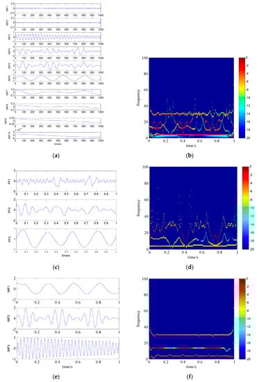 Decomposition results and time-frequency distribution of the multivariate signal with noise using EEMD, LMD and VMD methods. (a) IMF components of x(t) decomposed by using EEMD; (b) Hilbert spectrum distribution of the EEMD results; (c) PF components of x(t) decomposed by using LMD; (d) Hilbert spectrum distribution of the LMD results; (e) IMF components of x(t) decomposed by using VMD; (f) Hilbert spectrum distribution of the VMD results.