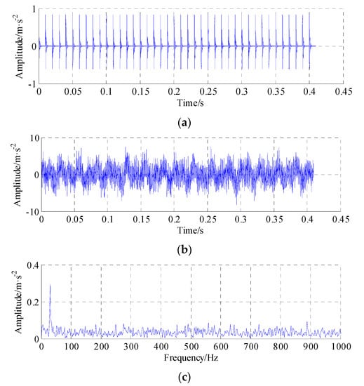 Simulated signal and its envelope spectrum. (a) Periodic impulse signal; (b) Raw fault signal with heavy noise; (c) Envelope spectrum of the raw fault signal.
