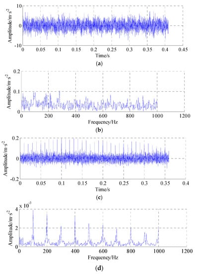 The first challenge is to reduce the noise interference and improve the signal to noise ratio (SNR) in the fault vibration signals. To address this issue, several methods have been proposed and are widely used in mechanical vibration analysis. Kang et al. introduced a wavelet soft-thresholding filter-based denoising method to eliminate the high-level noise from the acoustic emission (AE) time domain signals []. Cattani proposed a harmonic wavelet filtering technique (HWFT) that can easily enhance weak defect signals, and it can easily separate the periodic components of the signal from a mixed fault signal (even if at a certain scale approximation) [,]. Abbasion et al. studied the condition of an electric motor with two rolling bearings (one next to the output shaft and the other next to the fan) with one normal state and three faulty states each []. However, wavelet or harmonic wavelet de-noising is essentially a band-pass filter based applied on a Fourier transform with a time-variable window and is not self-adaptive in nature due to the fact different mother wavelets should be predefined for sub-bands. To address this challenge, empirical mode decomposition (EMD) and ensemble EMD (EEMD) were proposed and have shown their superiority over the wavelet and other traditional methods in many fault diagnosis applications, such as bearing fault diagnosis [,], gear fault diagnosis [,] and rotor fault diagnosis [,]. However, the EMD and EEMD still have some shortcomings, such as end effects and mixing problems [,] that still must be solved. Local mean decomposition (LMD) as a novel self-adaptive de-noising method can decompose the multi-component signals into several single-componet AM-FM signals []. The LMD has also been employed to extract the fault characteristic frequencies for condition monitoring of rotating machinery [,], unfortunately, in the actual engineering signals, a lot of extra and useless frequency components were generated along with the periodical impulse signals. On the whole, noise suppression may simultaneously attenuate target signal intensity if the target signal frequencies are involved in the noise bandwidth [].