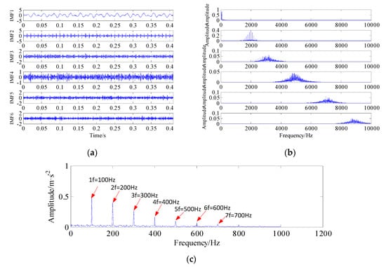 Figure 6c shows the envelop spectrum of IMF2 component. It was observed that the fault characteristic frequency f = 100 Hz and its harmonics (i.e., 2f, 3f, 4f, 5f, 6f and 7f) are extracted by using VMD method. Meanwhile, the amplitudes of spectral peak increase dramatically, thus making the extraction of fault frequencies easy and accurate. In summary, the experimental results fully illustrate that the proposed approach was able not only to detect the fault frequencies in a weak fault signal but also to remove noise well.