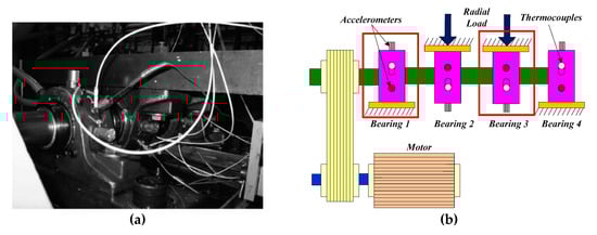 Bearing test rig; (a) Ball bearing fault test rig; (b) The schematic diagram of accelerated life test.