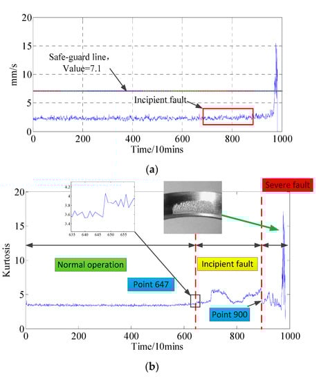 This accelerated life test was carried for 8 days, the equivalent vibration intensity (EVI) entire life-cycle curve and kurtosis entire life-cycle curve of rolling bearings 1 are respectively shown in Figure 8a,b. The detailed algorithm of EVI is given in our previous work []. Figure 8b reveals that the evolution of kurtosis can be divided into three stages, i.e., normal operation, incipient fault and severe fault stage. It also can be seen in Figure 8b that the failure scope of bearing 1 is from the 6470th minute (incipient failure point) to the 9840th minute (severe damage point). During the first five days of operation, no underlying trend was observed. After the test had been carried out for 6490 min (at the end of the 5th day), the EVI and kurtosis of the vibration measurements increased significantly in the serious damage stage.
