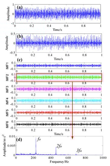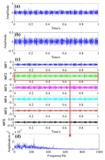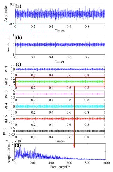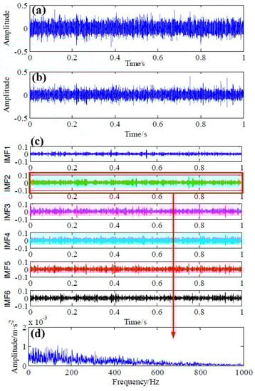 Results using the proposed method on the 6th day’s data (7300 min); (a) The original bearing vibration signal; (b) The improved AR-MED filtered signal; (c) The IMF components of improved AR-MED filtered signal generated by VMD method; (d) The envelope spectrum of IMF2.