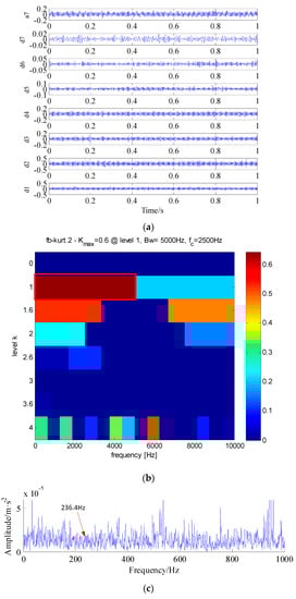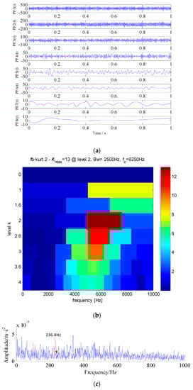 The kurtogram of the a7 sub-band component is displayed in Figure 14b, and the kurtogram of the PF2 component is displayed in Figure 15b, from which the optimal demodulation frequency band, namely (0 Hz–4896 Hz) and (5104 Hz–7396 Hz) can be detected. Thus a band-pass filter is designed to extract the potential features from the a7 sub-band component and PF2 component. Lastly, the envelope spectrum is applied to the filtered signal, the corresponding envelop spectrums are illustrated in Figure 14c and Figure 15c, respectively.