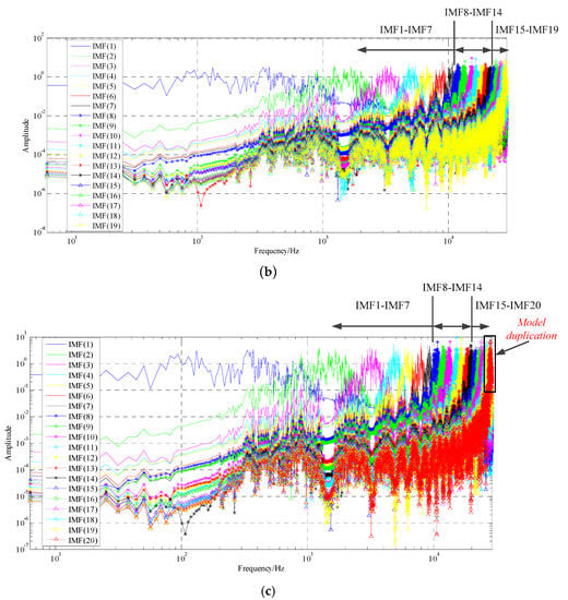 In order to accurately extract multiple fault impulses from the raw signal, the proposed improved AR-MED method was used to the raw signal, and the result of improved AR-MED denoising signal is given in Figure 18a, where the filtered signal clearly shows multiple impulses that are near the harmonics of the defect frequencies. Moreover, from Figure 18a, we also can see that the interval between the two periodic impulses is approximately equal to 0.0562 s, which is roughly equal to the pitting fault frequency (17.96 Hz) of the tested gear.Then the VMD method is utilized to analyze the filtered signal. Figure 18b,c show the spectrum of IMF modes extracted by VMD, where it is quite clear that the center frequencies coincide, a phenomenon (mode duplication) that emerged in model number K = 20, which demonstrate that model number K = 19 is better than K = 20.