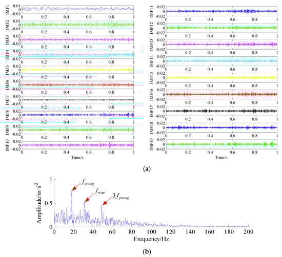 19 IMF components generated by VMD are given in Figure 19a. The corresponding envelope spectrum of IMF4 component (maximum kurtosis component, kurtosis = 6.0070) is shown in Figure 19b. It can be found the fault frequency 17.81Hz (it is roughly equal to the bull fitting fault frequency ffitting = 17.96 Hz) and its harmonic components (49.06 Hz ≈ 3 × ffitting, the pinion gear wear fault frequency (31.25 Hz ≈ fwear) are clearly observed in the envelope spectrum. The result indicates that there are local defects on the gear pair that match with the engineering application. Therefore, it can be concluded that the proposed hybrid method is able to accurately identify the multiple weak faults caused by a gear-pair, which is particularly appropriate for incipient multiple fault feature extraction.
