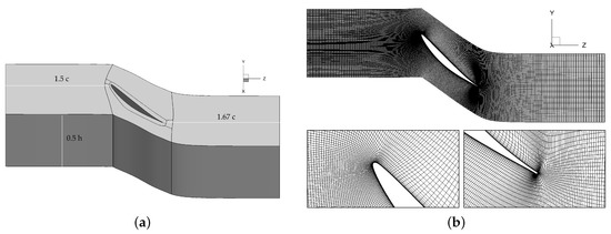 A linear compressor cascade is used to investigate the corner separation, which is representative of highly-loaded compressor stator blades. The cascade consists of 13 blades and was tested experimentally by Ma et al. [5,6]. In the experiment, the inflow velocity was m/s, with a chord Reynolds number . The experimental parameters are summarized in Table 1.
