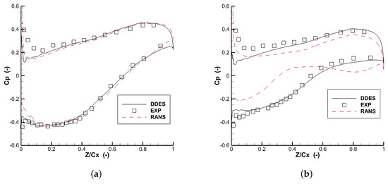 The static pressure coefficient distributions from RANS and DDES are both in good agreement with the experiment along the blade surface at span, as shown in Figure 2a. However, in the corner area, the distribution from DDES is more accurate than RANS, as shown in Figure 2b.