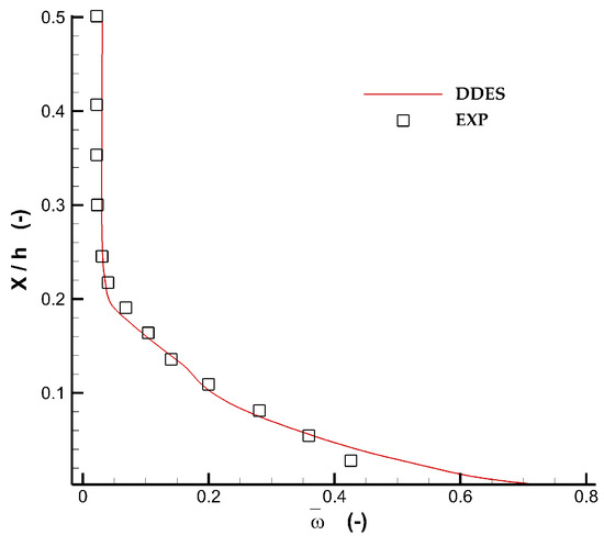 The pitchwise-mass-averaged total pressure loss coefficient at axial chord downstream from the trailing edge: DDES and experiment results [6].