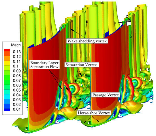 where is the vorticity tensor and is the shear strain tensor. Instantaneous vortical structures from DDES result are given in Figure 6 with the Mach number rendered on the isosurface. The stripe vortices near the trailing edge represent shedding wakes. Additionally, there are the horseshoe vortex, passage vortex and separation vortex near the corner area. The separation vortex is the mix of the pressure side branch of the horseshoe vortex, the passage vortex and the boundary layer separation flow. In this study, it is found that the location of the passage vortex is relatively steady, and a similar finding has been obtained in [13], while the structure and location of the separation vortex vary significantly with the development of corner separation. The suction side boundary layer separates much earlier, so there is no suction side wake vortices in the corner area. Based on these observations, the following part will discuss the interaction between the corner separation and pressure side wake vortices.