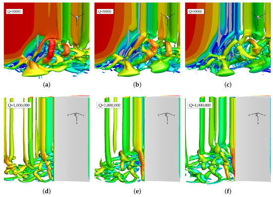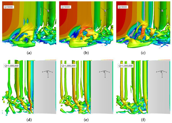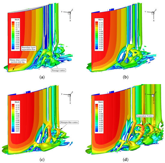 The interaction between the corner separation and wake-shedding vortices is remarkably different before and after the appearance of the hairpin-like vortex. The Q isosurfaces at three time instants before the emergence of hairpin-like vortex are given in Figure 10, and another three time instants after the appearance of hairpin-like vortex are given in Figure 11 for comparison. The Q isosurfaces are rendered by the Mach number to demonstrate the local velocity. As given in Figure 10, the corner separation interacts with the wake vortices before the hairpin-like vortex appears, and according to Figure 9, the size of the separation region is relatively smaller. In this paper, this period is called the “immature corner separation”. The boundary layer separation flow gradually merges with the passage vortex and develops into the hairpin-like vortex. As a consequence, the range of separation gradually enlarges, and the boundary separation flow does not fully develop in the separation vortex. The passage vortex is the main secondary flow at the bottom of corner area, as shown in Figure 10a–c. On the one hand, the passage vortex merges with the boundary separation flow, producing the hairpin-like vortex. On the other hand, the passage vortex interacts with shedding wake vortex. With the merging of passage vortex, the shedding of the wake is delayed near the corner area. Naturally, the interaction is not strong, so only a small area of wakes is influenced. The passage vortex continually merges with the shedding wake vortex and makes it deform, as shown in Figure 10d–f. Hence, before the corner separation matures, the interaction between the passage vortex and the wake vortex dominates.