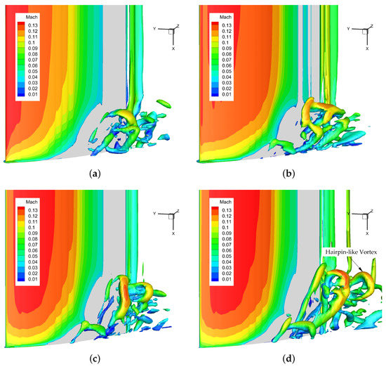 According to the DDES results at four time instants given in Figure 8, the hairpin-like vortex always appears in the junction region during the occurrence of corner separation. The hairpin vortex is a coherent structure in wall turbulence transport momentum [32], and it emerges because of perturbations of small upward motion, which is induced by differences in upward flowing velocities depending on the distance from the wall. Additionally, the leg ends of hairpin vortices could gradually converge, resulting in provoked eruptions and producing new hairpin vortices [33]. In the compressor cascade environment, as demonstrated in Figure 8a, the boundary layer separation flow rolls up due to the blockage of the strong adverse pressure gradient. The passage vortex and blade surface boundary layer block the downstream migration of both ends of the separation flow. As a result, the body of separation flow rises up and sheds faster than the legs, as shown in Figure 8b. Thus, the separation flow gradually develops into the vortex like a hairpin, as shown in Figure 8c,d.