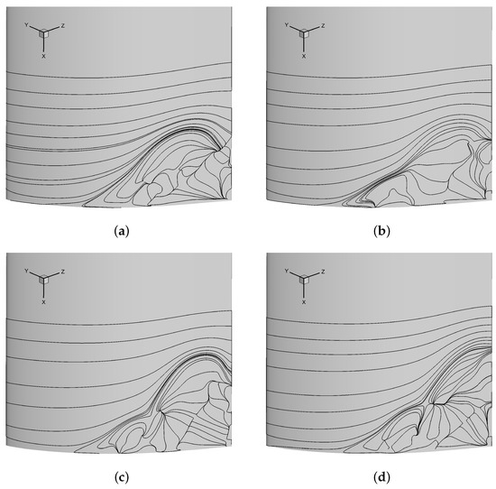 The inlet flow produces two legs of the horseshoe vortex at the leading edge. The suction side branch of horseshoe vortex develops with the mainstream along the blade surface. With the inducing of the suction side branch of horseshoe vortex, the suction side boundary layer separates, as shown in Figure 7a. The strong streamwise adverse pressure gradient blocks the separation flow and makes the separation line keep rising up, as shown in Figure 7b. Then, the separation flow gradually rolls up and shears with the mainstream. Meanwhile, the cross-passage pressure gradient drives the pressure side branch of the horseshoe vortex and the passage vortex towards the suction side, which continually merges with the separated flow, as shown in Figure 7c. The boundary layer separation flow develops into the hairpin-like vortex near the trailing edge. Likewise, it is interesting to notice that in recent studies about several high-loaded compressors, the hairpin-like vortex has also been observed, with the usage of high-fidelity turbulence simulation tools [11,12,13]. Then, the scale of corner separation enlarges rapidly, as shown in Figure 7d. Hence, the suction side boundary layer massively separates, and the massive separation flow merges with the passage vortex and develops into the new separation vortex. During this period, the corner separation produces a series of large-scale vortices.