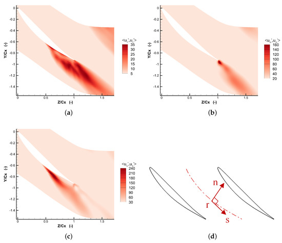 For convenience, a rotated Cartesian coordinate system is formed, as given in Figure 12d. Note that in the new coordinate system, s denotes the streamwise direction, n the wall-normal direction and r the radial direction. The distributions of normal Reynolds stresses are given through Figure 12a–c.