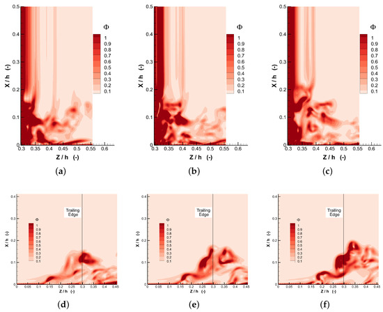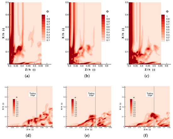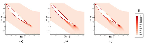 The distribution of before the appearance of the hairpin-like vortex is presented in Figure 17. During this period, the passage vortex is the main secondary flow at the bottom of corner area. Therefore, the loss of the corner area dominates below the span, and the high-loss area gradually rises up with the development of separation flow, as shown in Figure 17d–f. The loss from the wake vortex decreases rapidly after shedding, while the loss from the corner area decreases slowly, and the high-loss area is below about span, as shown in Figure 17a–c. As discussed above, during this period, the passage vortex continually merges with the wake vortex, which causes additional loss in the wake area. With the blockage of the passage vortex, the pressure side wake vortex deforms in the corner area near end wall, which causes that the loss distribution below the span. Therefore, the interaction between the passage vortex and wake vortex causes significant additional loss in the corner area before the corner separation matures.