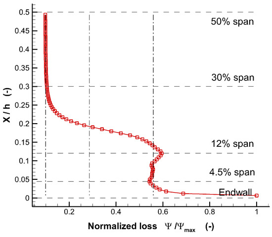 and its distribution along the radial direction is given in Figure 14; also note that in Figure 14, the abscissa axis is normalized. The represents the end wall, and the represents the mid-span of the cascade. According to the flow structures discussed above and Figure 14, the distribution of can be divided into four parts, which respectively represent the losses from different flow structures. The first part, 30–50% span, represents the loss from the wake vortex without the influence of the separation vortex; the second part, 12–30% span, represents the losses from the wake vortex and separation vortex; the third part, 4.5–12% span, represents the losses from the wake vortex, separation vortex and passage vortex; the last part, 0–5.4% span, represents the losses mainly from the wake vortex, passage vortex and end wall boundary layer. The loss from the wake vortex without the influence of the separation vortex is small, while the loss increases rapidly with the influence of the separation vortex, and the interaction significantly increases the loss. The influence of corner separation can reach up to span. There exists a small peak at span, where the interaction between the separation vortex and wake vortex is the strongest. The loss in the third part keeps at a high value and is nearly constant. This indicates that the separation vortex-wake vortex interaction and the passage vortex-wake shedding interaction throughout this region are fully developed. Because of the viscous friction from the end wall, the loss increases rapidly in the fourth part. To sum up, the losses from passage vortex and wake vortex dominate at about 0– span, and the covering range enlarges to span, when considering the influence of the interaction between the separation vortex and wake vortex.