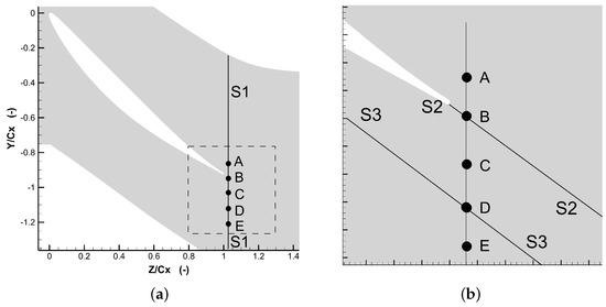 The location of the slices –, – and –. The distributions of along five spanwise Lines A, B, C, D and E are extracted, and their positions are also given. Note that – and – slices are parallel to the cascade outlet. (a) Slice –; (b) Slice – and –.
